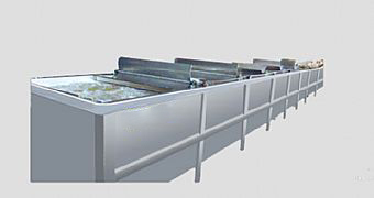 化冰機采用氣泡與熱水協(xié)作,有效地使物料充分解凍,物料落入水中,利用槽體中翻騰的水將物料攪動,把冷氣帶出擴散到空氣當中。